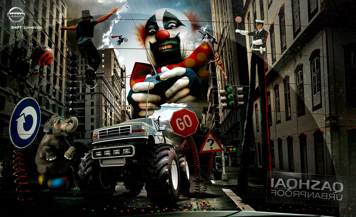 The idea is that the city is full of danger so you need to upgrade, need to be safe in a Nissan Qashqai. By the way, that's me in the background :)