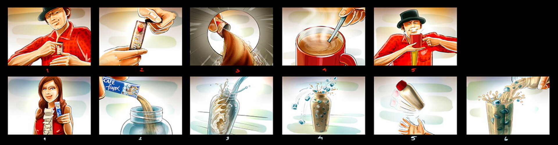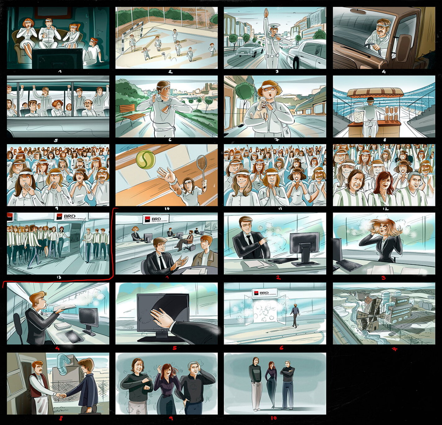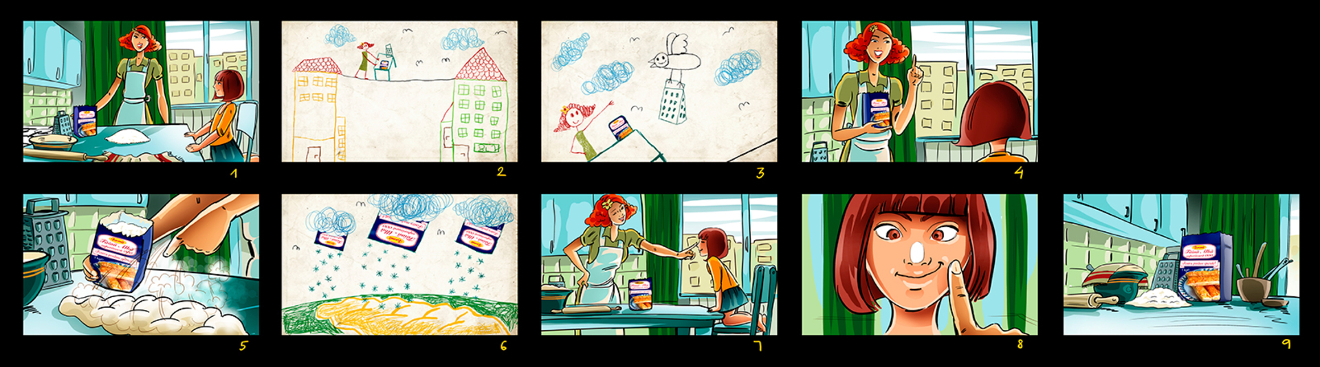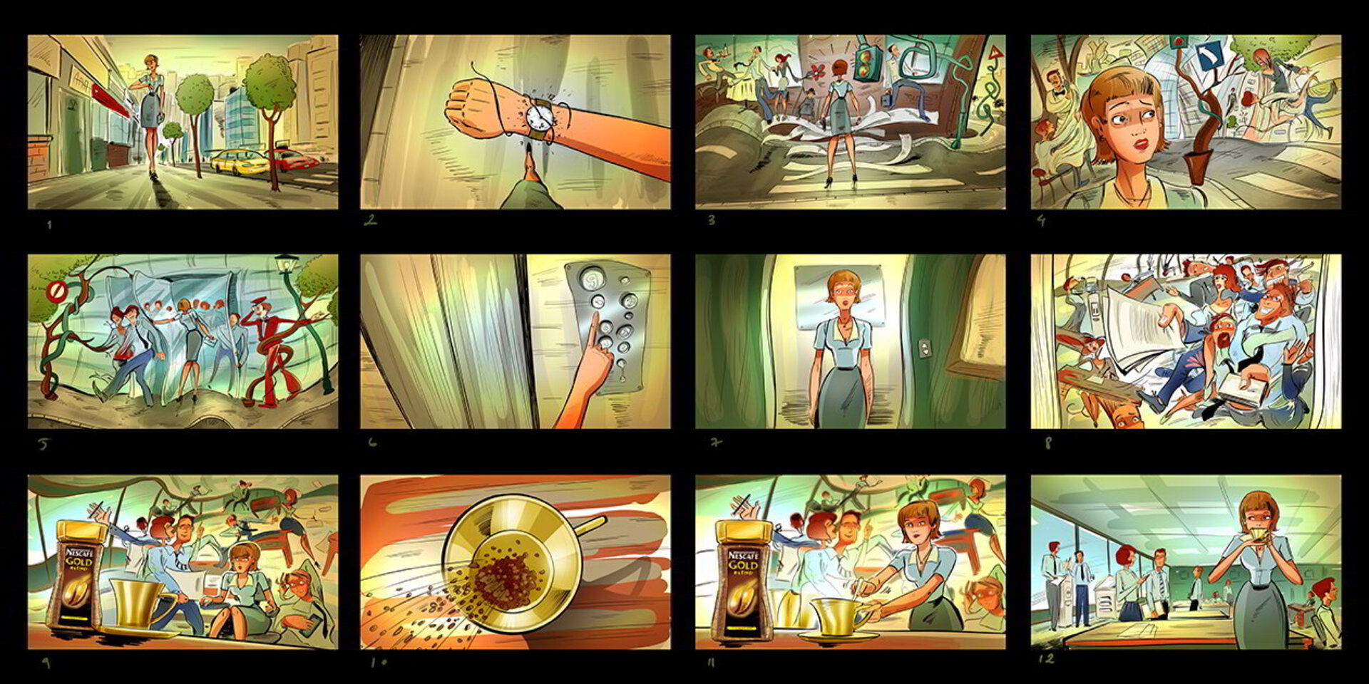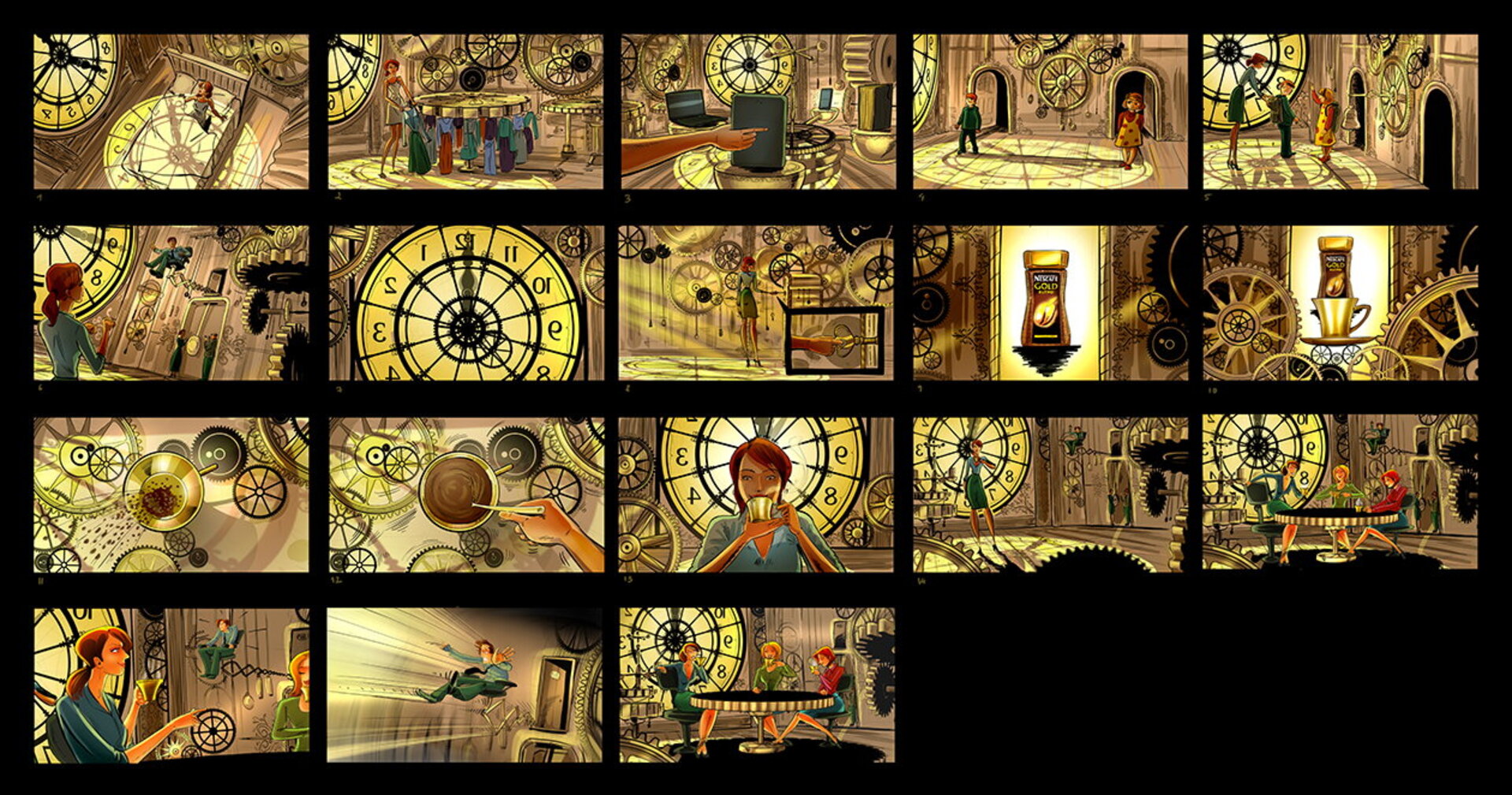 I have a lot of these :) When I draw a storyboard, I think first about the client. I try as much as I can to make it understandable even without text explanations. That's why i try to act like a video camera and take some simple but nice snapshots. This way it's easier for the client, who's neither a copywriter, nor an art director (most of the times).