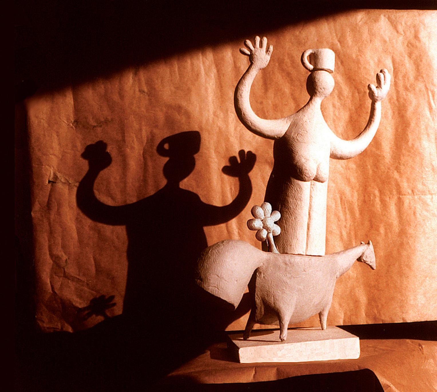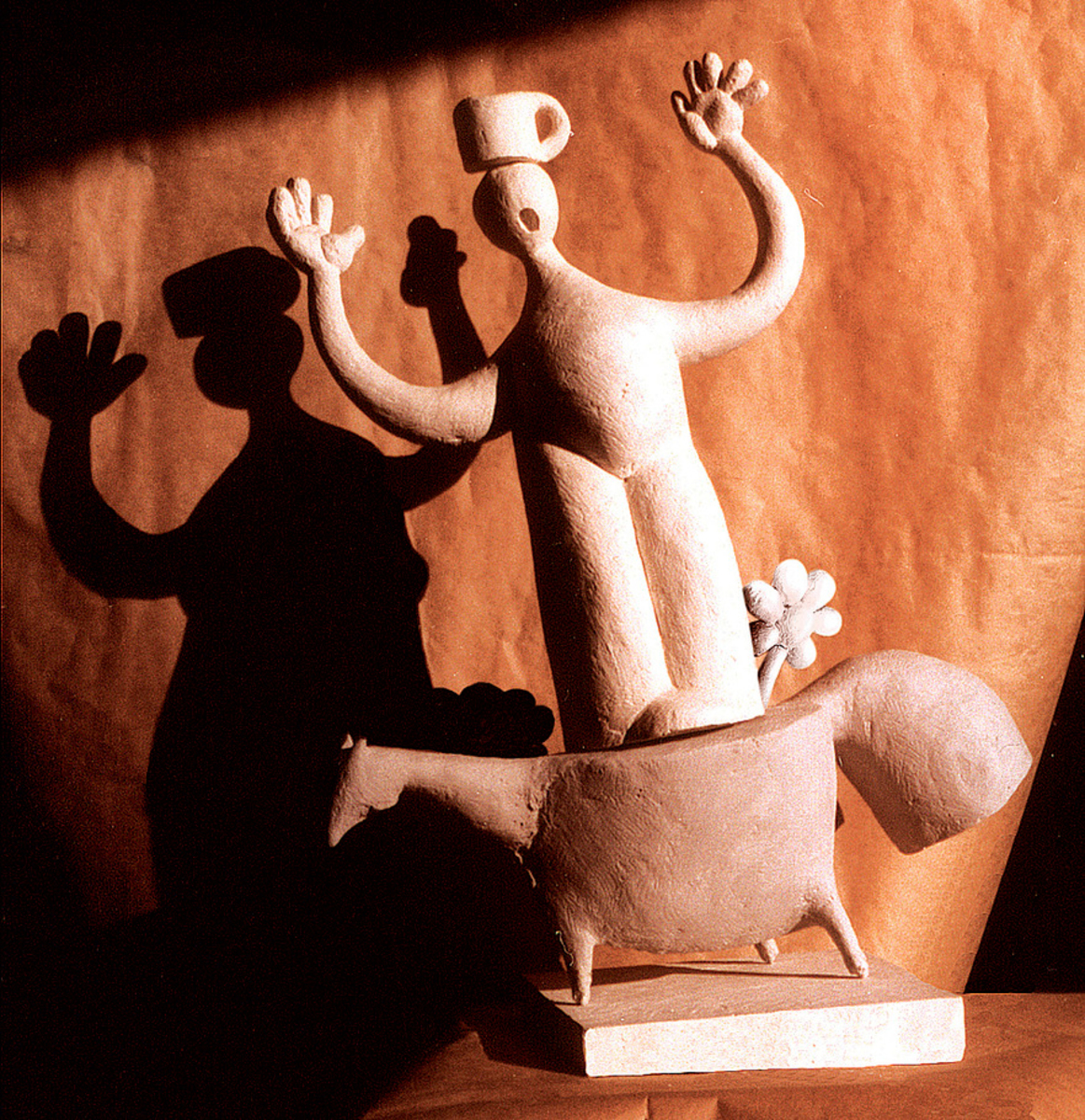 It's a sketch I made for my graduation the Art University in Bucharest, Sculpture Department. It's a man scared to death that the cup on his head might fall down. He barely stands near a flower that grows right from the horse underneath. With so many possible meanings, it's easy to build up a story behind. The truth is there are no meanings. Even I would ask that character "why are you doing this? It's absurd!".
